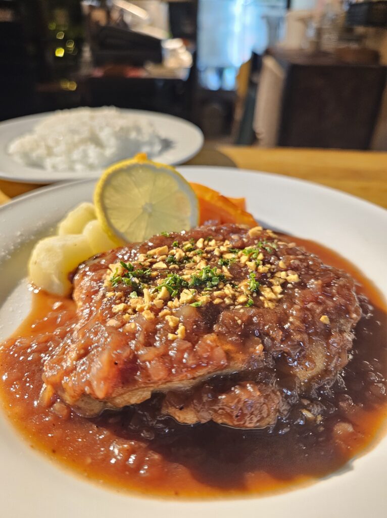 季節限定春キャベツ入りハンバーグステーキトマトポン酢ソース始まりました。もう20年近く皆さまのリクエストの声にお応えして春のこの季節限定で登場している人気ハンバーグです。